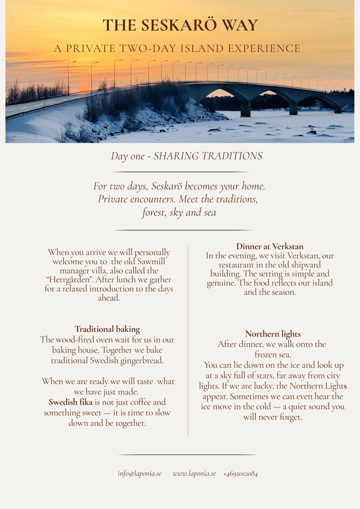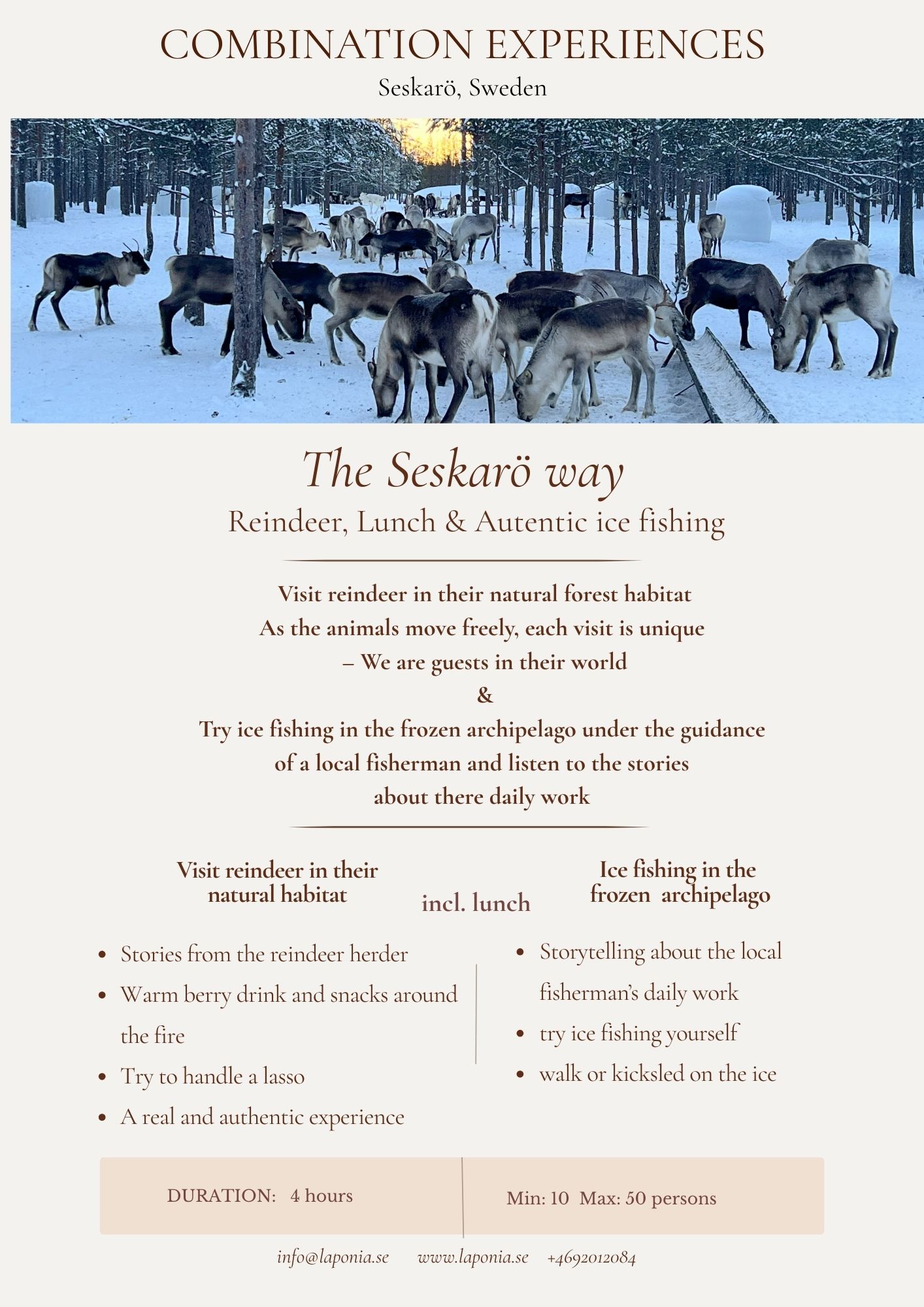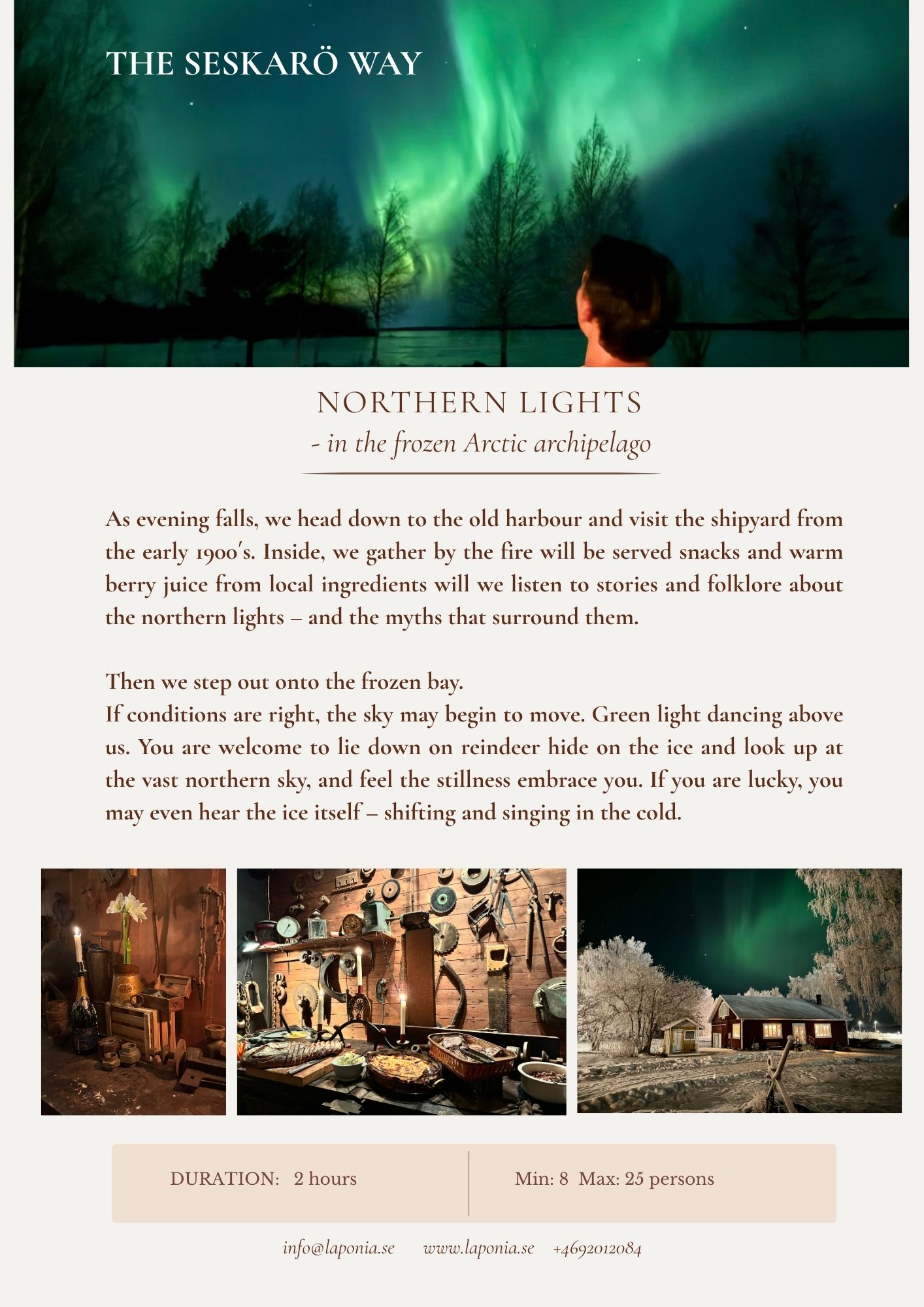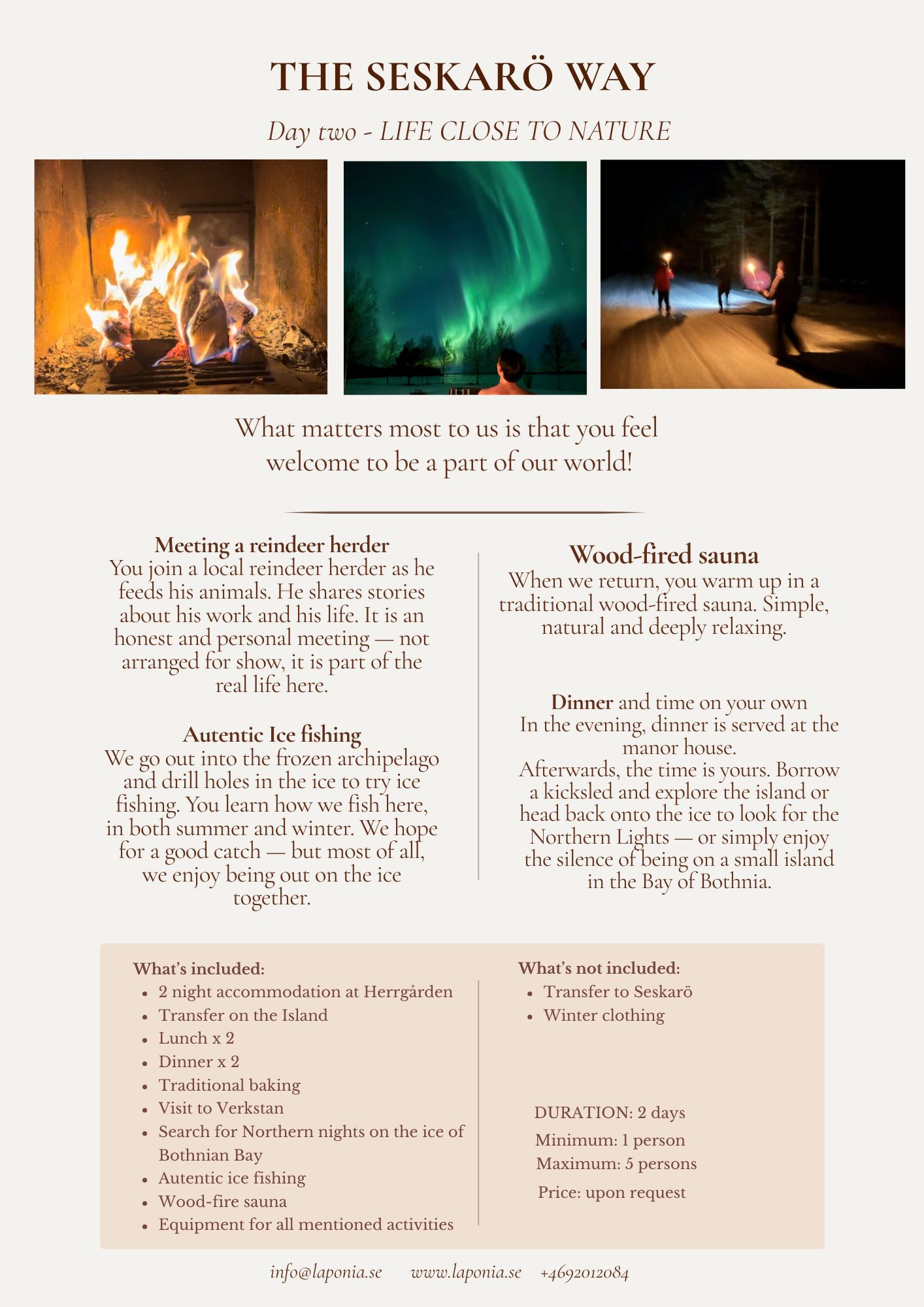 Laponia Winter Experience Hope you enjoy our activities in “The Seskarö way” that you find here below! Contact us for more information about schedules and prices. Info@laponia.se +4692012084
